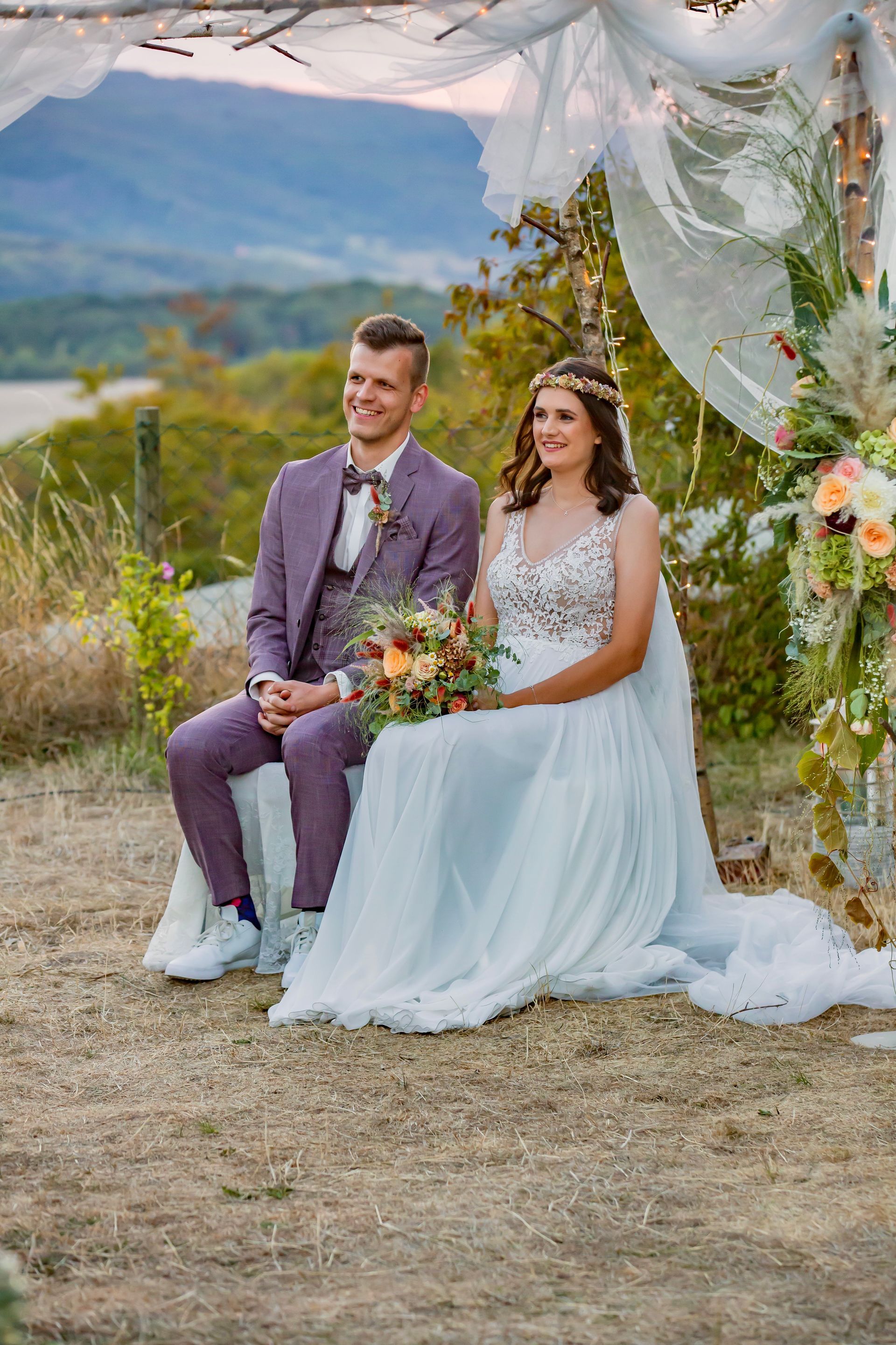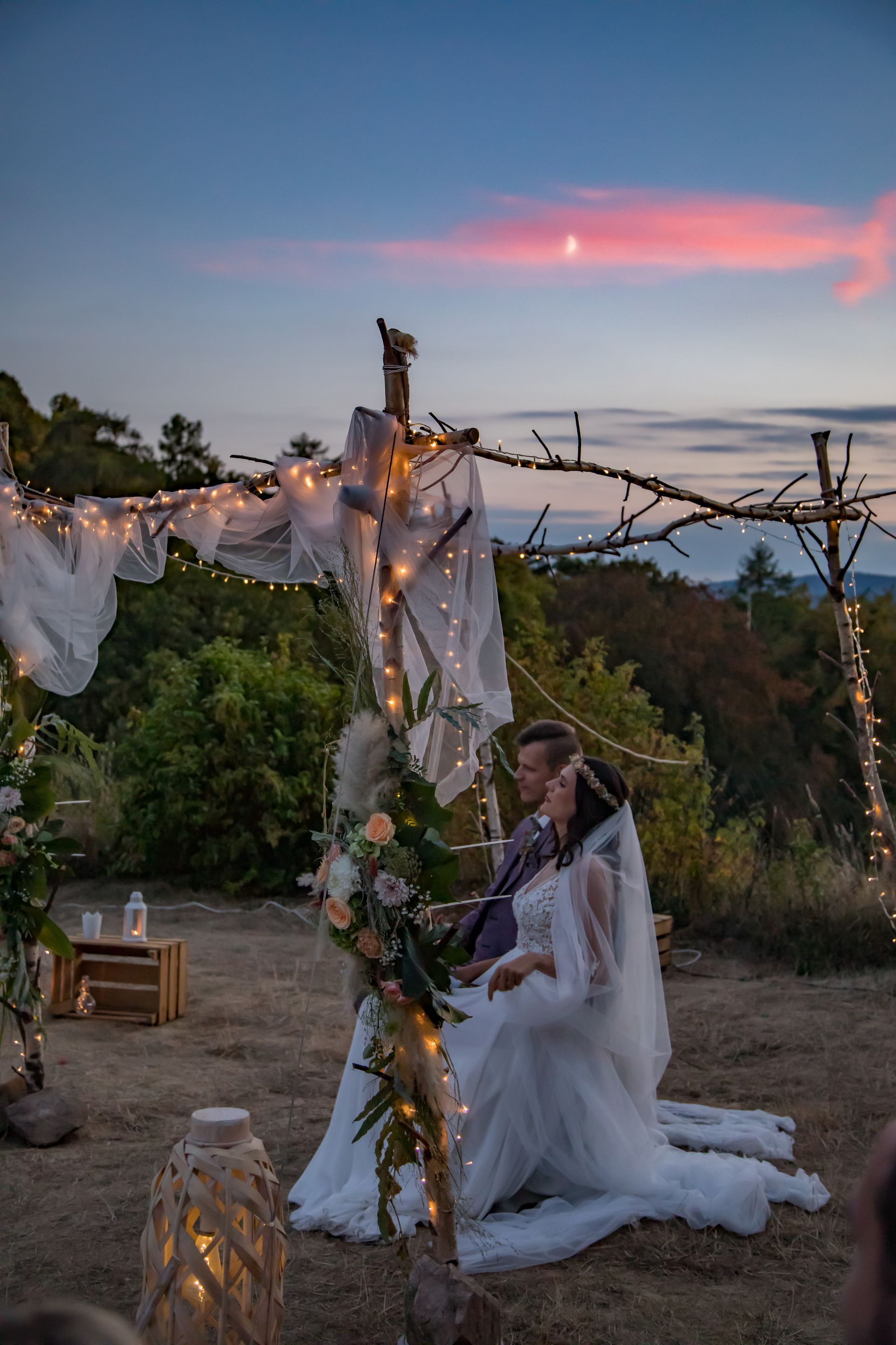 „Wir haben uns (...) am Abend trauen lassen, denn wir wollten eine entspanntere Atmosphäre während der Trauung, weil sich vorher im Laufe des Tages die Gäste untereinander bereits kennenlernen konnten. Außerdem träumten wir von einer freien Trauung zum Sonnenuntergang bis zur Dämmerung mit einer stimmungsvoll dekorierten Location mit Lichterketten etc…