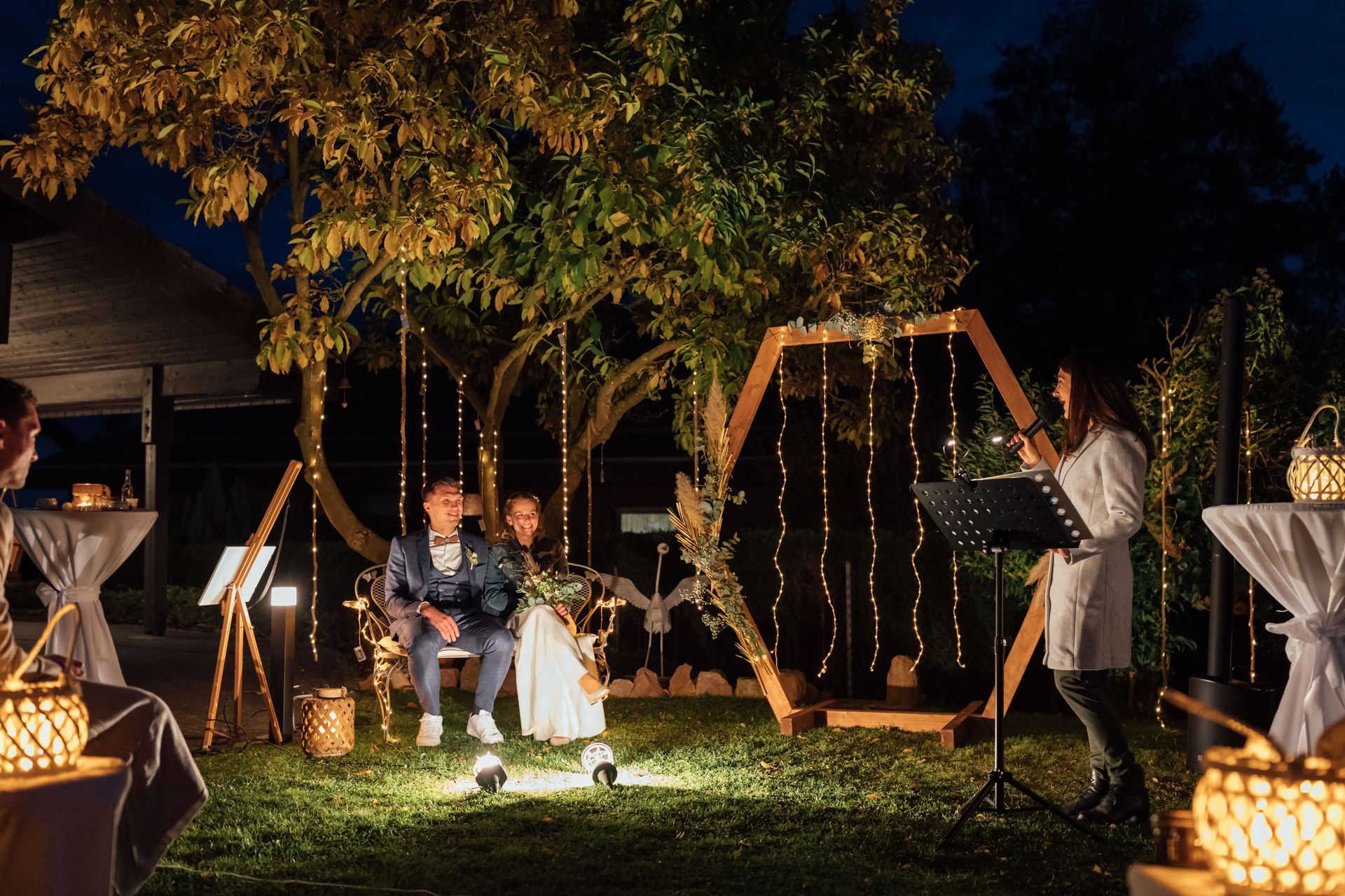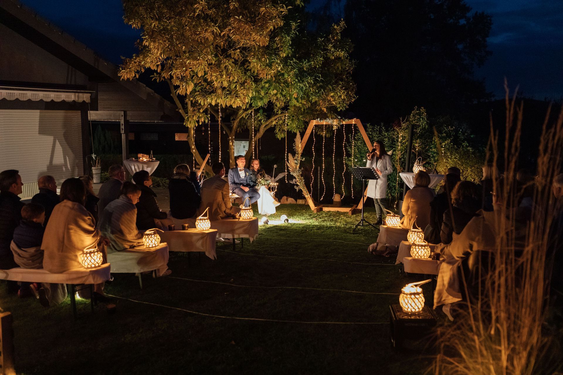 Jana und Rafi haben sich von mir in ihrem eigenen Garten trauen lassen. Die Traulocation wurde von den Trauzeuginnen mit ganz viel Liebe und vielen Lichtern heimlich hergerichtet und war für alle Gäste eine atemberaubende Überraschung.