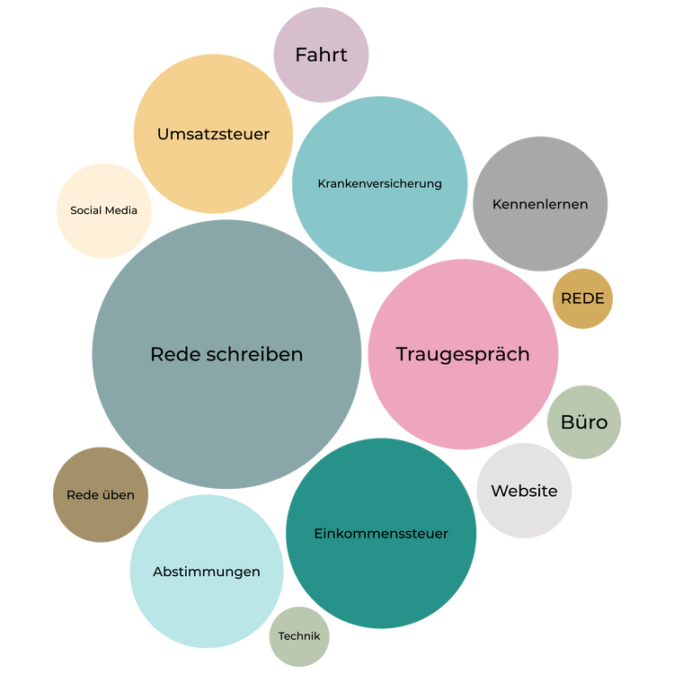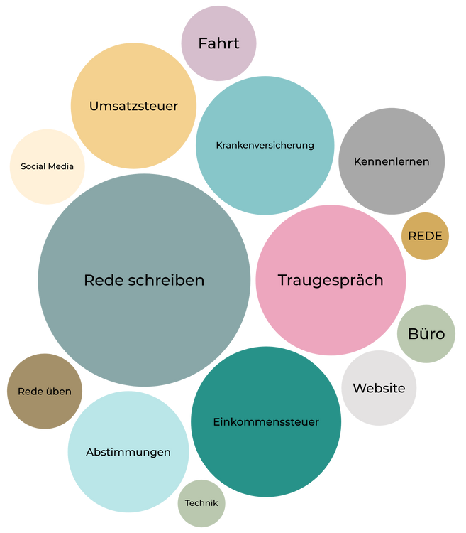 Werft einen Blick auf die Größe der Kreise, um zu sehen, welcher Anteil des Preises wofür steht. Wer findet die Rede selbst? Tipp: ich hab sie extra in Großbuchstaben geschrieben, weil die Stunde der Trauung einen so kleinen Anteil hat!